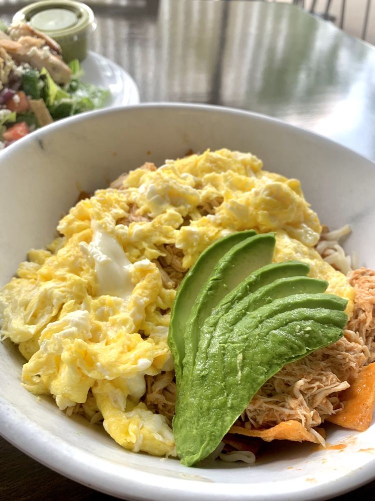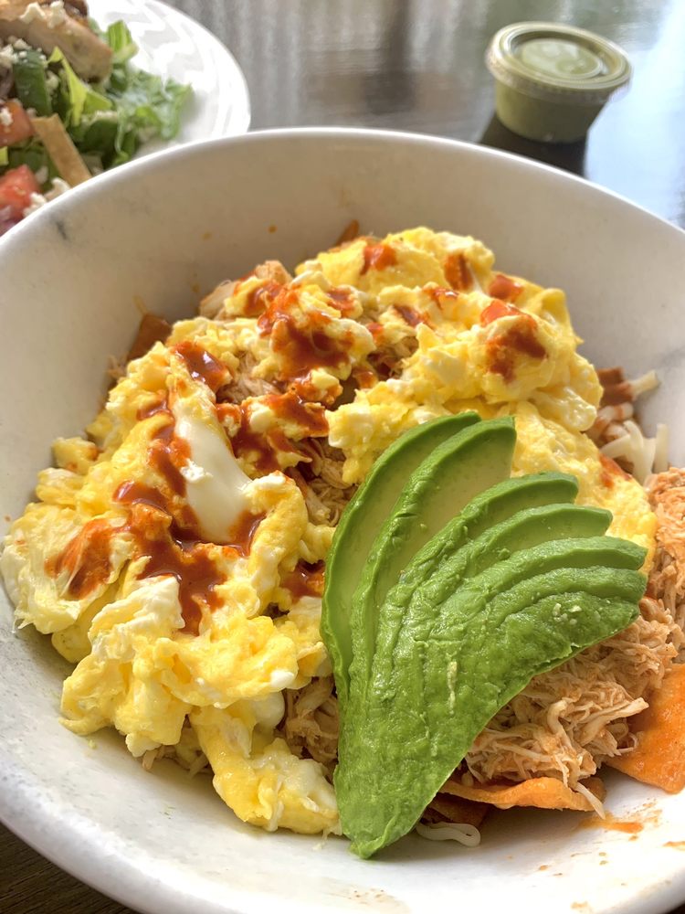Scrambled eggs with shredded chicken breast, bell peppers, potatoes, Jack cheese and salsa. Served with fire roasted tomato sauce and your choice of side.